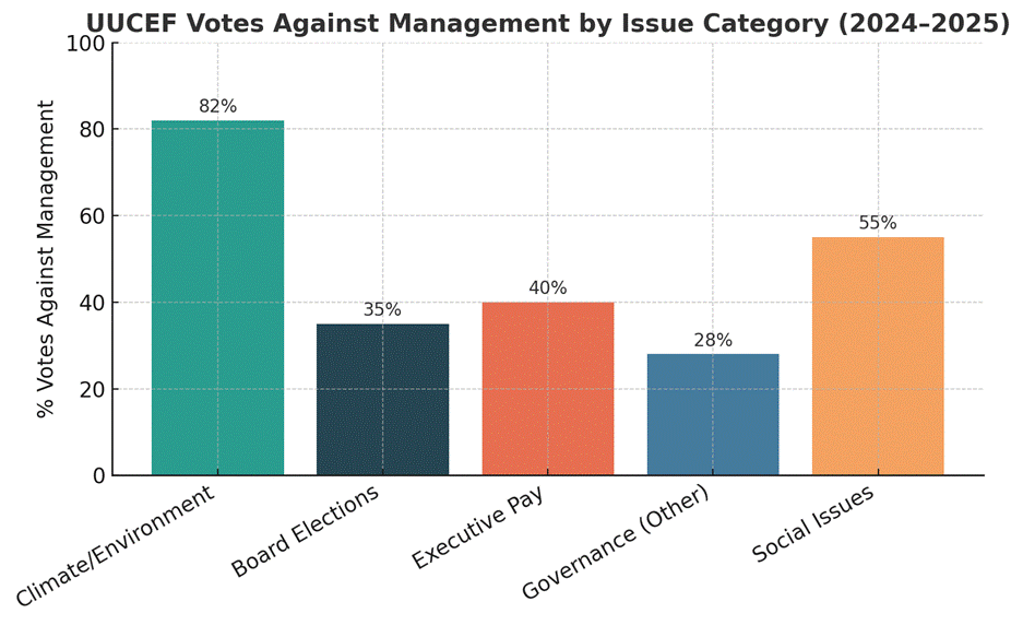 In the most recent proxy season (2024–2025), UUCEF cast votes on more than 2,200 proposals across over 160 shareholder meetings. We supported the majority of ESG-related proposals, especially those addressing climate action and board diversity, and opposed roughly 40% of executive compensation packages where pay practices raised concerns. Importantly, most of our votes aligned with ISS proxy policy recommendations rather than company management – reflecting a consistently active and values-driven approach.