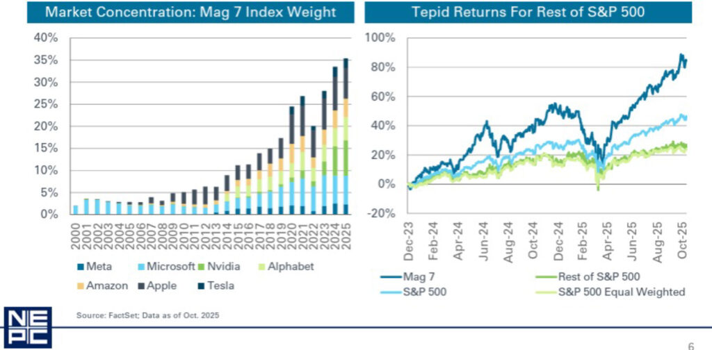 A major driver of equity market performance has been the continued acceleration of the artificial intelligence (AI) theme – see chart below. While valuations appear stretched, NEPC emphasized that AI-driven mega-cap companies have been among the largest contributors to earnings growth and overall market returns—creating a clear risk for investors who are significantly underweight these names in the near term.